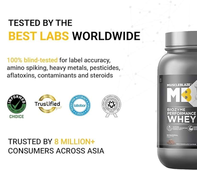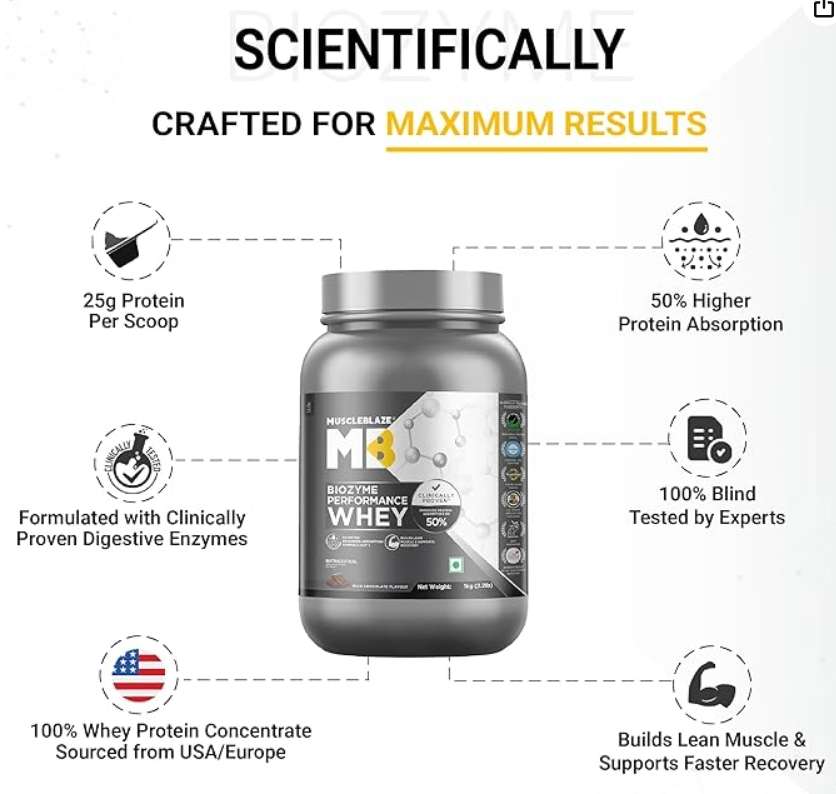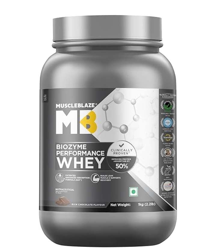 MuscleBlaze Biozyme Performance Whey Protein Powder, Rich Chocolate (1kg / 2.2lbs) | 25g Protein Per Scoop | Clinically Tested 50% Higher Protein Absorption
